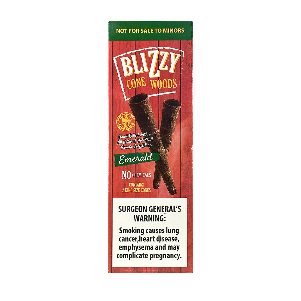 Blizzy Cone Woods Emerald are hand rolled with the popular dark premium naturally cured Hot Skull Fronto Leaf Wrap. No chemicals or additives. 10 Packs of 2 (20ct) or a Single pack of 2 Kingsize Cones in a resealable pouch.