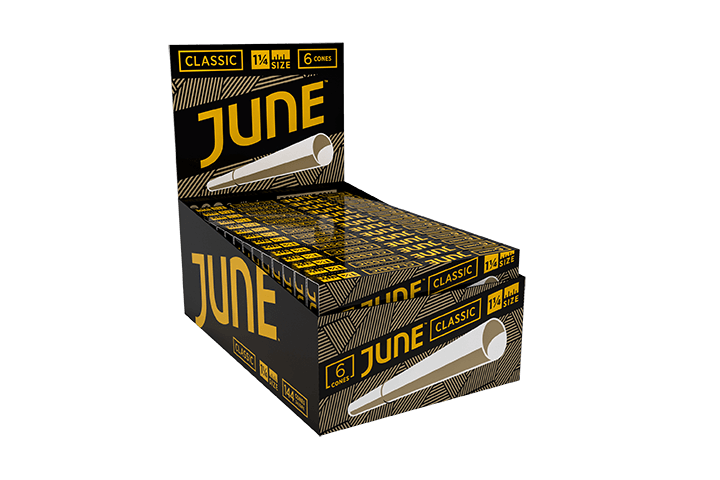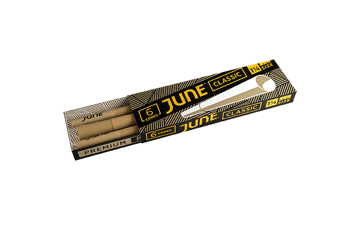June Classic Unbleached 1 1/4 Cones are pre-rolled cones made with minimally processed unbleached papers. The cones have a natural brown color, plant based gum line and the June Cones logo Built-in Tips, Slow Burn, Vegan Friendly, Gluten Free, NON GMO. 6 Cones Per Pack