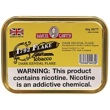 Samuel Gawith's 1792 Flake is rich, dark, and full-bodied pipe tobacco marked by its strong character and beautiful tonquin notes. Fire-cured Tanzanian leaf and steamed and pressed Virginias are pressed then steam-pressed to further marry and caramelize the flavors before being cut into decadent flakes.