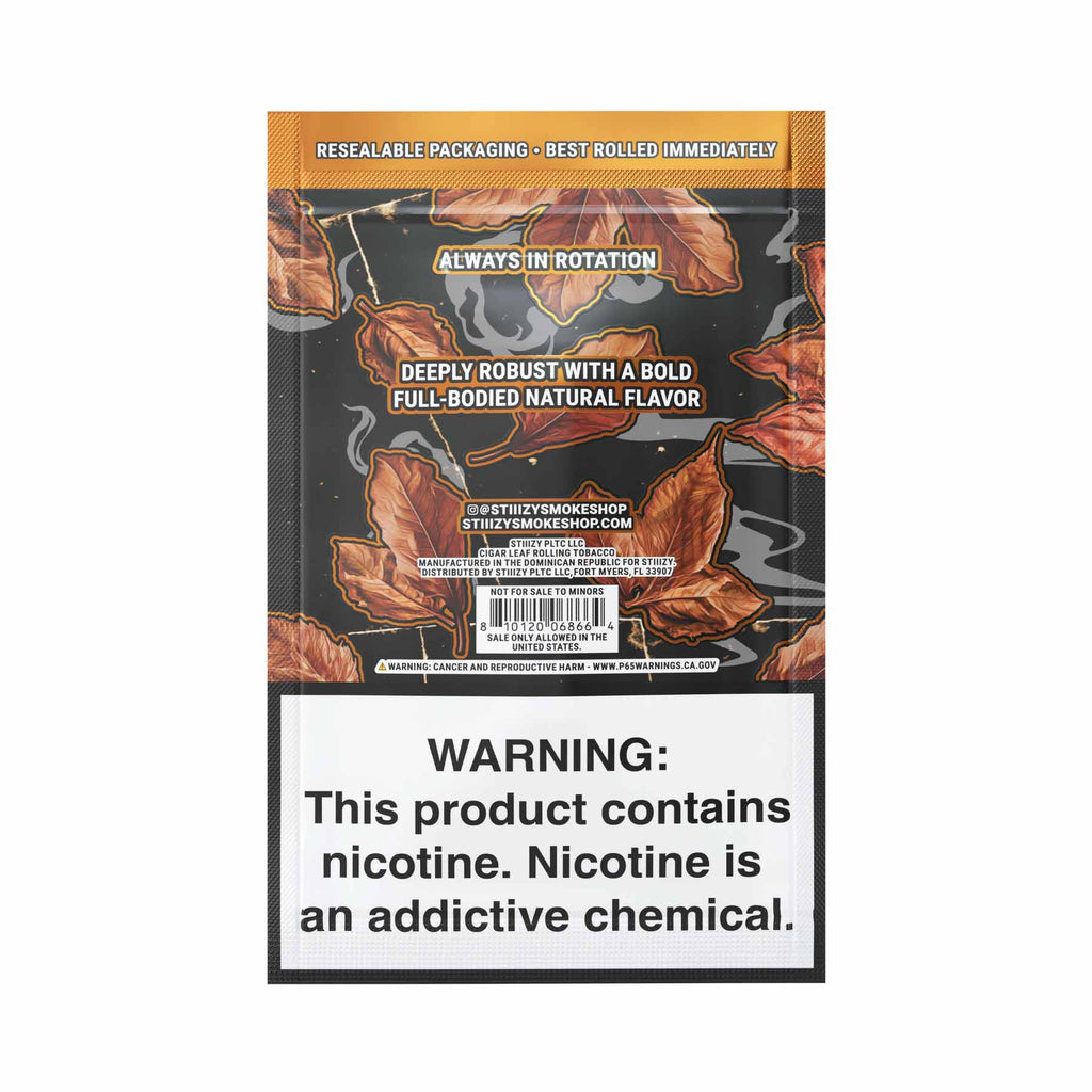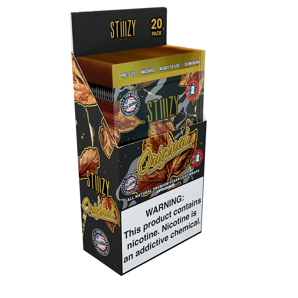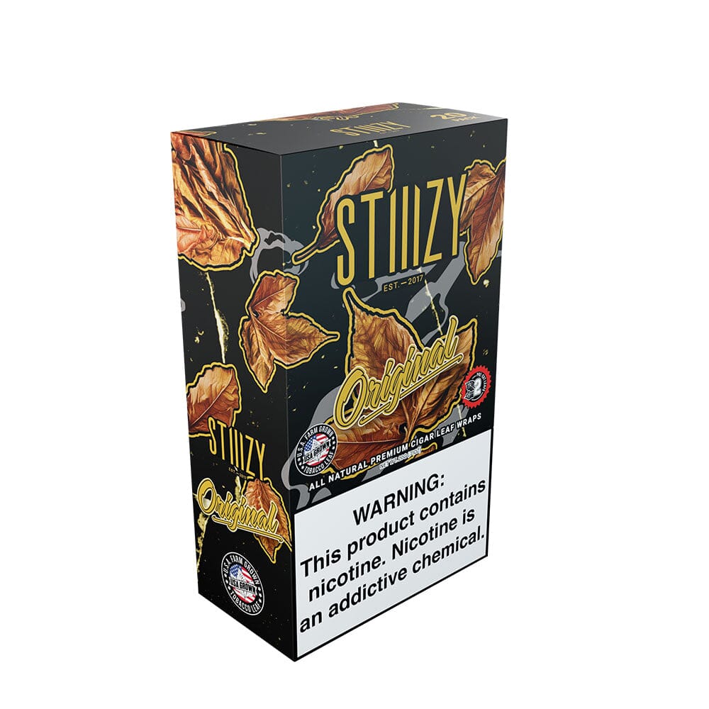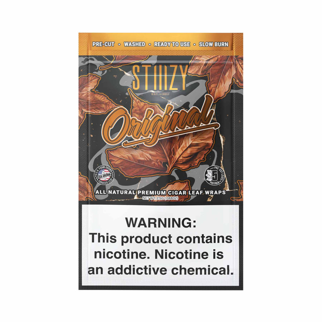 STIIIZY Original blunt wraps are all natural USA grown tobacco leaf that offers a deeply robust, rich, and full-bodied natural profile. Each wrap embodies the unadorned and authentic essence of premium tobacco, offering a bold and satisfying smoking experience. Pre-cut and Washed and Refined for a convienent and consistent burn every time.
